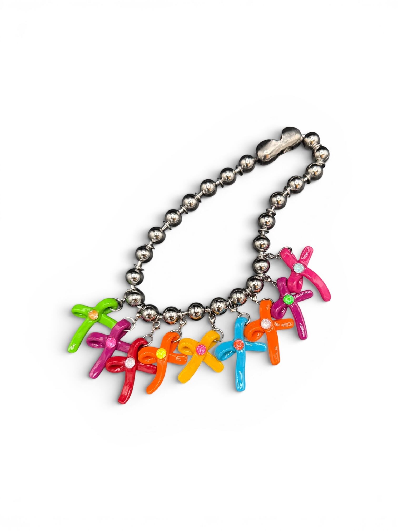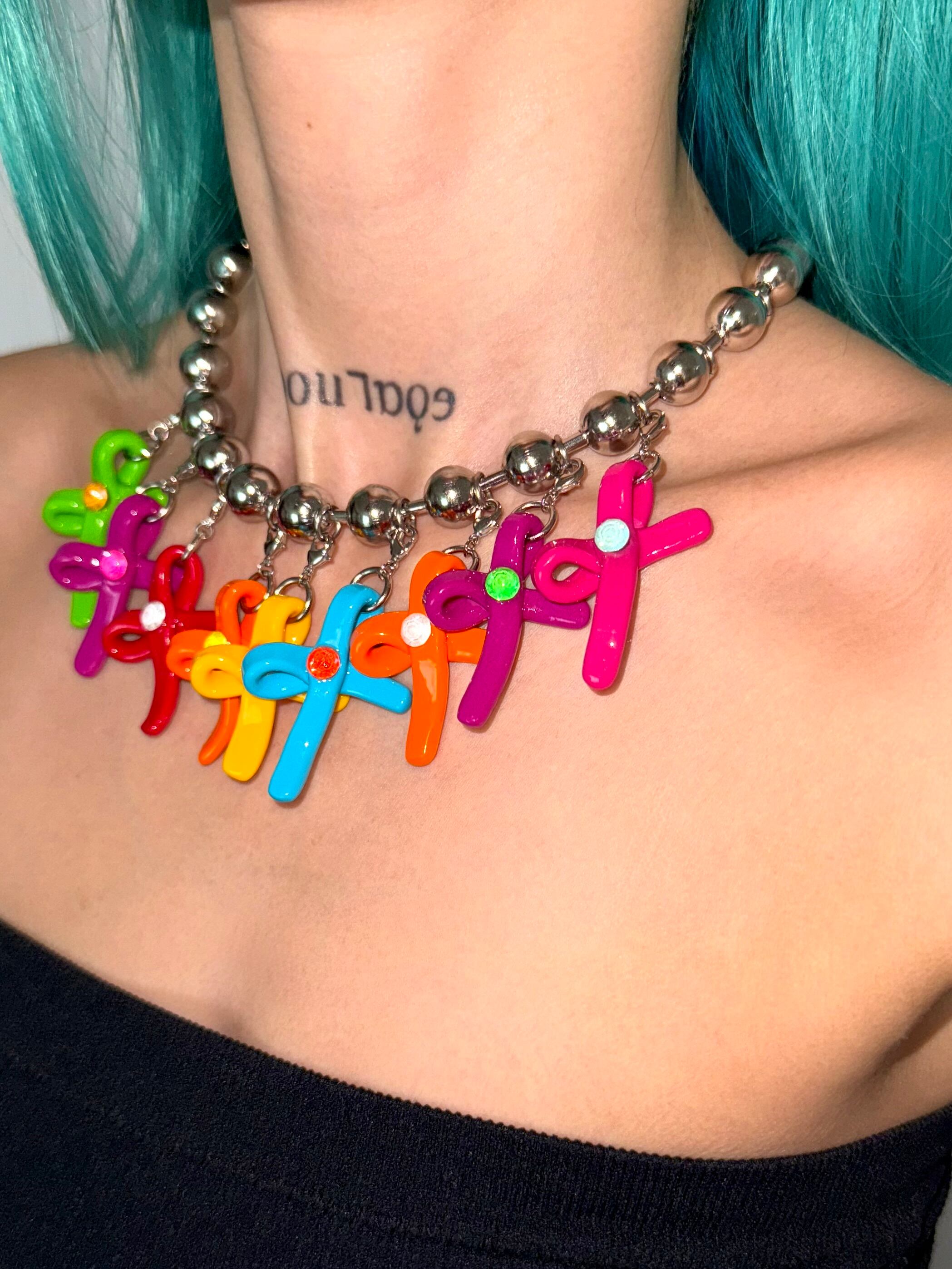 カラフルなリボンが9つ連なるゴージャスなネックレス。